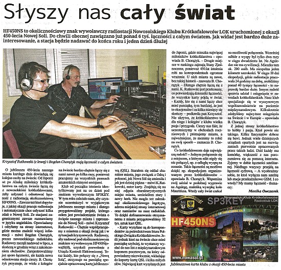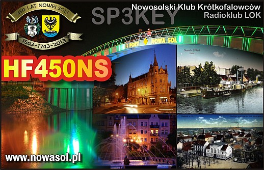 Nowosolski Klub Krótkofalowców SP3KEY pragnąc aktywnie uczestniczyć w obchodach 450-lecia powstania Nowej Soli uruchomił radiostację pracującą pod okolicznościowym znakiem wywoławczym HF450NS.