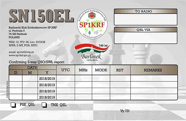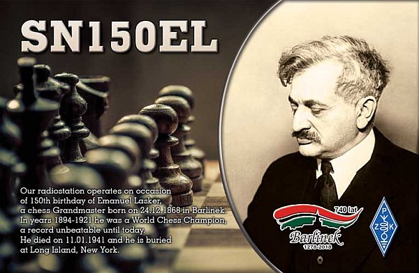 Autor: SP1KRF, data: 14 października 2018r.Od 9 października br. członkowie Barlineckiego Klubu Krótkofalowców SP1KRF są QRV na pasmach spod znaku okolicznościowego SN150EL z okazji 150 rocznicy urodzin Emanuela Laskera, szachowego mistrza świata urodzonego w Barlinku.