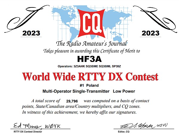 Klubu SP3PJY z Nowego Miasteczka pracując pod znakiem contestowym HF3A zajmujął 1 miejce spośród krajowych stacji w największych krótkofalarskich zawodach świata - CQ World Wide RTTY DX Contest 2023.