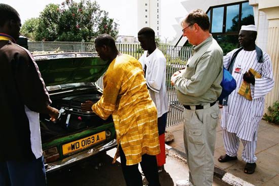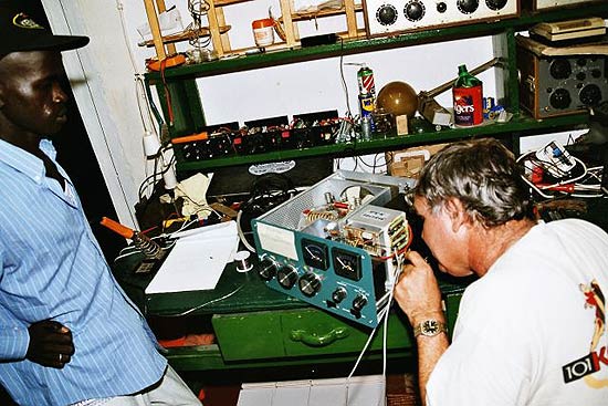 Wtedy nastąpiła kolejna katastrofa. Najpierw krótka przerwa w dostawie energii elektrycznej a po chwili duże przepięcie. Tak duże, że 4 zasilacze do transceiverów, wszystkie zasilacze do przenośnych komputerów i dwa wzmacniacze mocy zostały uszkodzone. Piątek popołudniu w muzułmańskim kraju to niedobra pora na szukanie pomocy. Pojechałem do miasta Serekunda, gdzie jest więcej sklepów niż w Banjul i kupiłem 2 duże ładowarki do akumulatorów.