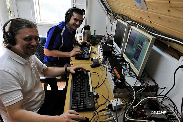 Lewa strona pomieszczenia stacji CR3L: przy oknie Ruslan, UA9ONJ z Novosybirska, bliżej Jan, DL7JV, z Berlina. Nadają na 28 MHz.