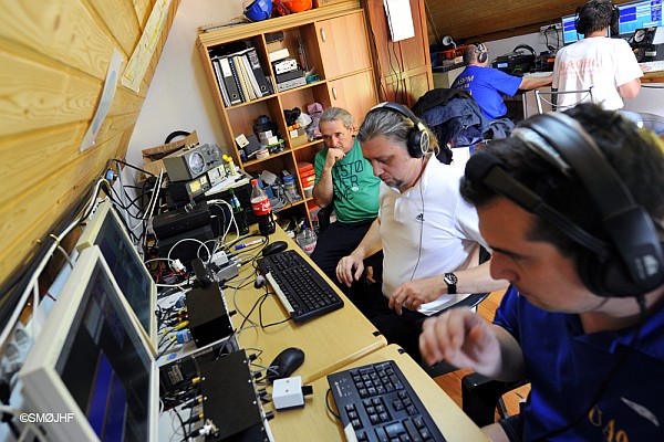 Prawa strona pomieszczenia stacyjnego: Mikail, UA9PM, stoi przy radiostacji, bliżej siedzi Ulf, DL5AXX - obydwaj nadają na 21 MHz, a najbliżej Ulrich, DJ2YA, przesłuchuje pasmo 14 MHy.